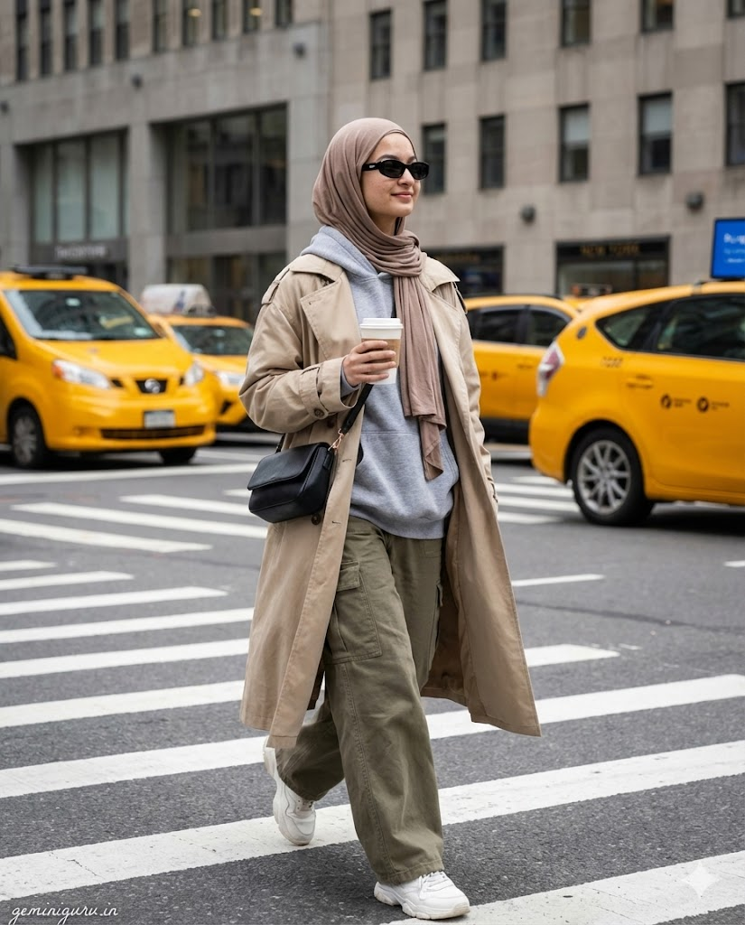PROMPT: High-fashion streetwear portrait. Subject is a young Muslim woman wearing a beige oversized trench coat over a loose hoodie and wide-leg cargo pants. Wearing a color-coordinated jersey hijab draped loosely. ACCESSORIES: Retro black sunglasses, chunky white sneakers, and a crossbody bag. POSE: Walking across a busy New York crosswalk, holding a coffee cup. Looking sideways (candid). LIGHTING: Natural overcast city light (softbox effect). Urban background with yellow taxis and concrete buildings. Low angle shot.