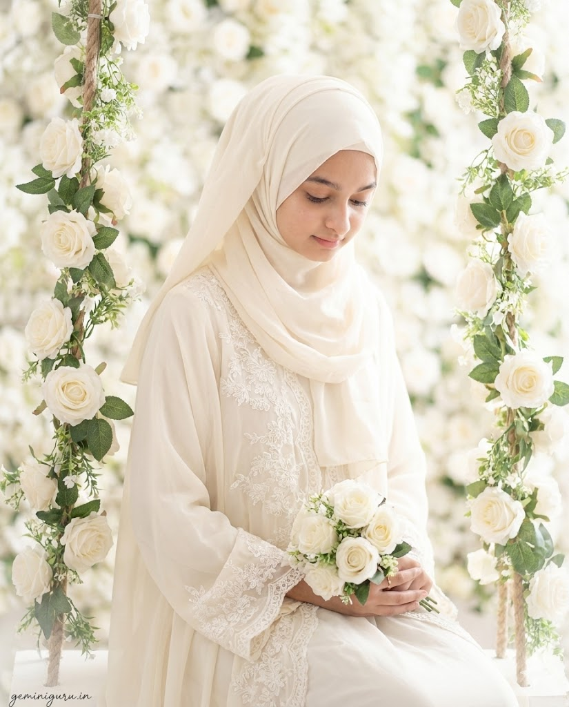 PROMPT: Ethereal Nikkah (wedding) portrait. Subject is wearing a pastel pink or ivory chiffon abaya with delicate lace embroidery. Matching chiffon hijab wrapped elegantly. POSE: Sitting on a floral swing or vintage chair, looking down shyly (Nazar). Holding a small bouquet of white roses. LIGHTING: Soft, bright “High-Key” lighting. Dreamy bloom effect. Background is a wall of white flowers (bokeh). 8k resolution.