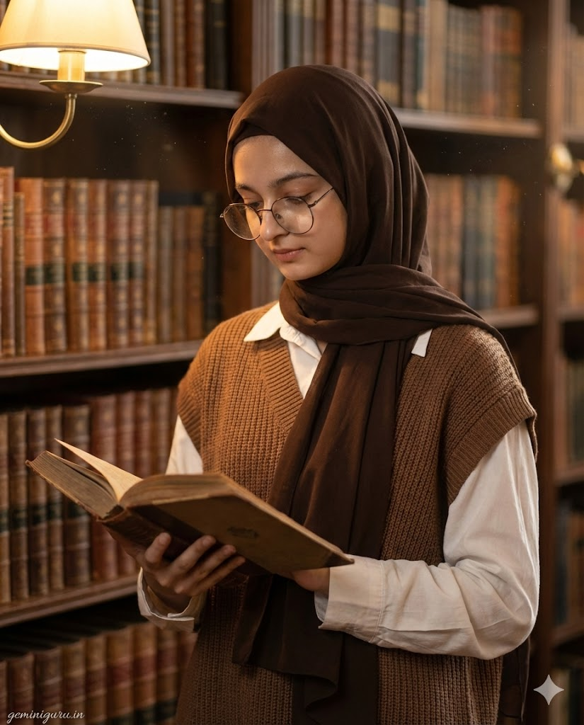 PROMPT: Aesthetic “Dark Academia” portrait in a vintage library. Subject is wearing a brown oversized knitted sweater vest over a white shirt. Wearing a dark brown or rust-colored cotton hijab. ACCESSORIES: Round wire-rimmed reading glasses. Holding an open vintage hardcover book. LIGHTING: Dim, warm library lamp light. Dust motes dancing in the light. Background is rows of blurred books.