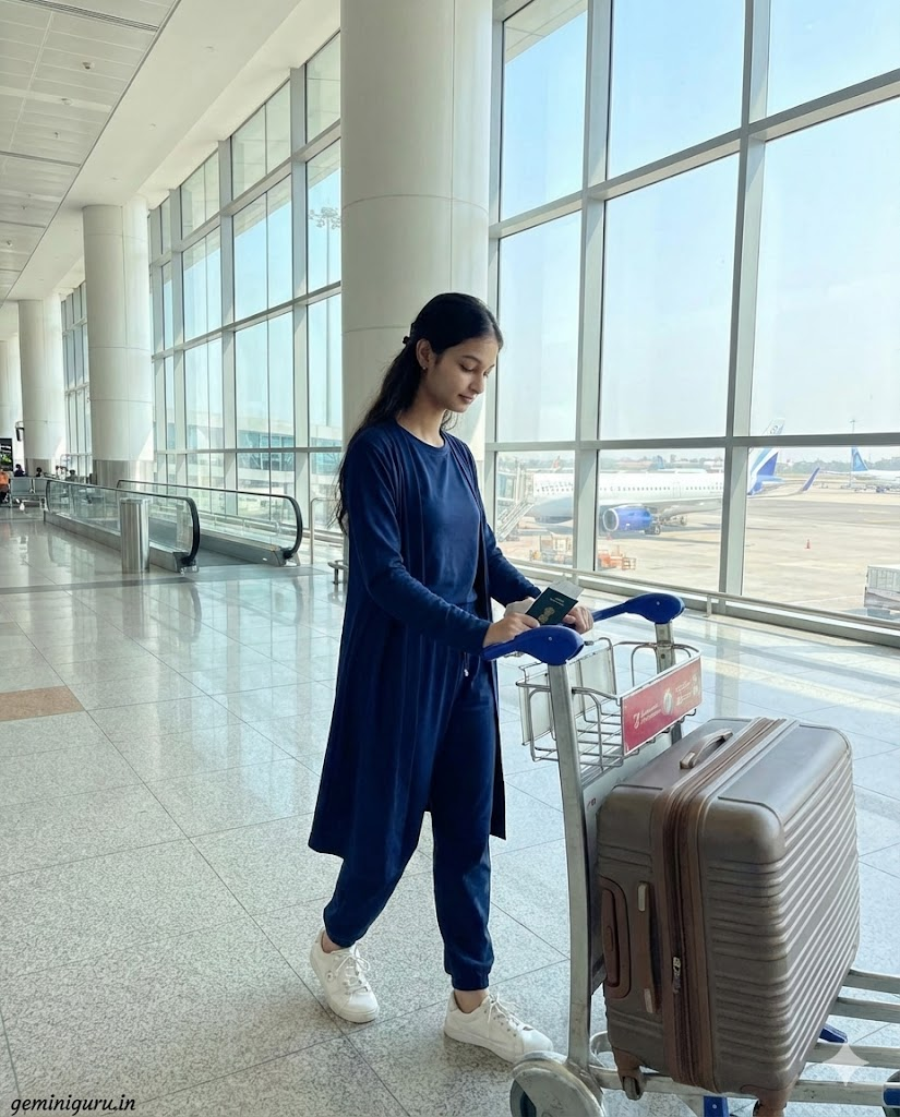 PROMPT: Cinematic travel lifestyle shot at a modern international airport terminal. Subject is wearing a comfortable modest travel outfit (matching tracksuit or long cardigan). POSE: Sitting on a suitcase or walking with a luggage trolley. Looking at a passport or flight board. LIGHTING: Bright, cool airport lighting. Large glass windows with airplanes visible in the background. Modern and clean.
