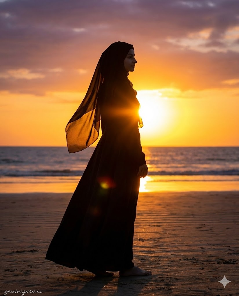 PROMPT: Artistic silhouette portrait during sunset at a beach or rooftop. Subject is wearing a flowy hijab/abaya. POSE: Standing sideways, looking at the horizon. The wind is blowing the fabric gently. LIGHTING: Intense golden sun directly behind the subject (backlight). The edges of the hijab are glowing with light (rim light). The face is in shadow but features are softly visible.