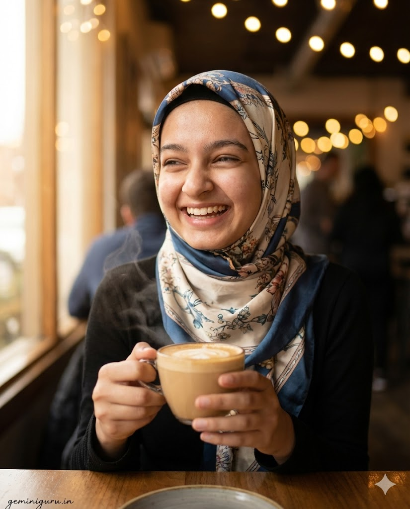 PROMPT: POV shot from across a cafe table. Subject is a smiling Muslim girl wearing a stylish printed satin scarf. POSE: Holding a latte cup with both hands near her chin. Laughing candidly. LIGHTING: Warm, cozy cafe lighting. Bokeh lights in the background. Steam rising from the coffee. Authentic and friendly vibe.