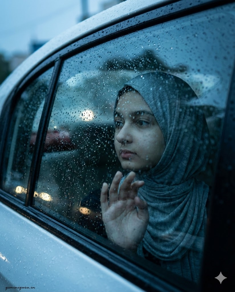PROMPT: Cinematic moody shot taken from outside a car window. It is raining. Raindrops on the glass are in focus. Subject is sitting inside wearing a cozy grey jersey hijab. POSE: Looking out of the window thoughtfully. Hand resting on the glass. LIGHTING: Blue-toned overcast light. Street lights reflecting on the wet glass. Soft, pensive atmosphere.