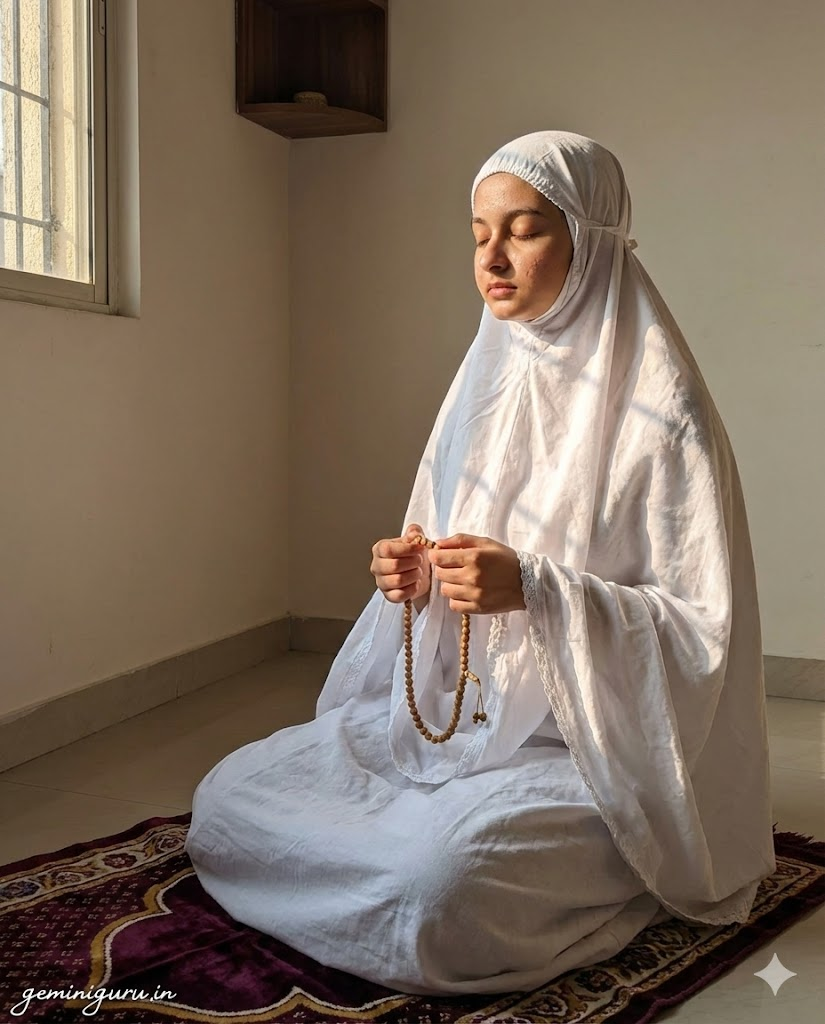 PROMPT: Peaceful spiritual portrait. Subject is wearing a traditional white or cream prayer dress (Isdal/Telekung). POSE: Sitting on a velvet prayer mat, holding prayer beads (Tasbih). Eyes closed or looking down in reflection. LIGHTING: Warm, soft lamp light or morning sunlight streaming into the room. Peaceful, quiet atmosphere.
