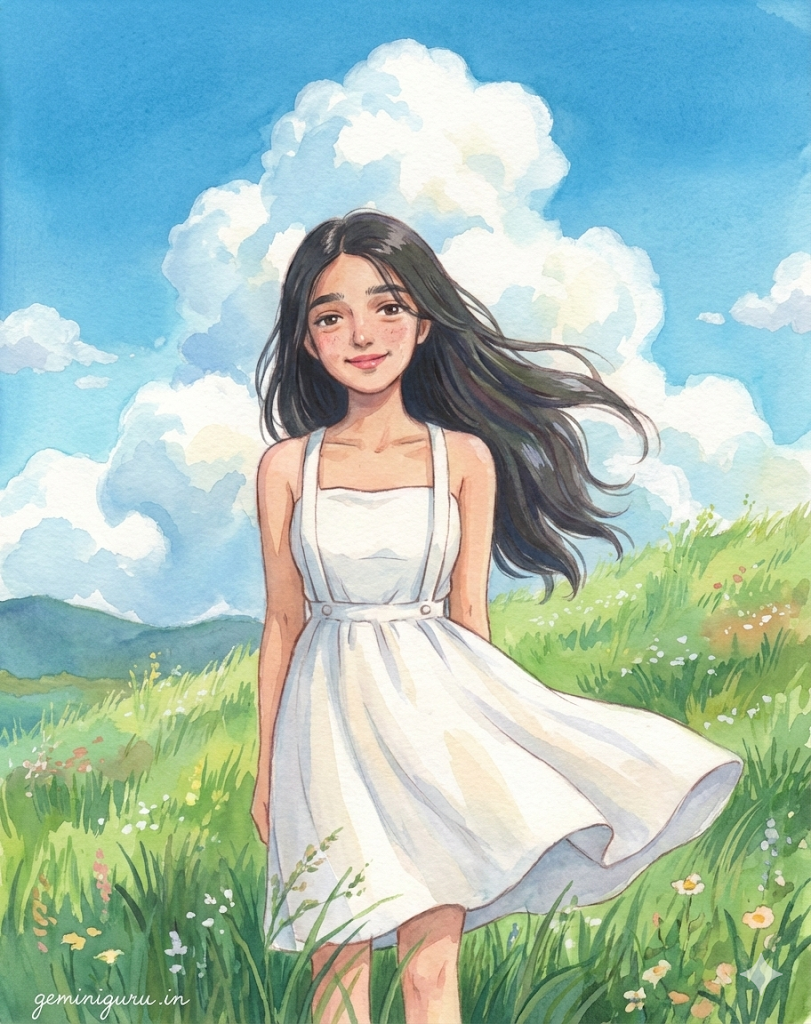 PROMPT: Anime style portrait inspired by Studio Ghibli (Hayao Miyazaki). Subject is standing in a lush, green grassy meadow with fluffy cumulus clouds in a bright blue sky. OUTFIT: Simple, vintage countryside clothing (white shirt, suspenders, or sundress). Wind blowing the hair and clothes gently. ART STYLE: Hand-painted watercolor and gouache textures. Soft, pastel color palette. No sharp black outlines. Dreamy, nostalgic atmosphere. 8k resolution wallpaper.