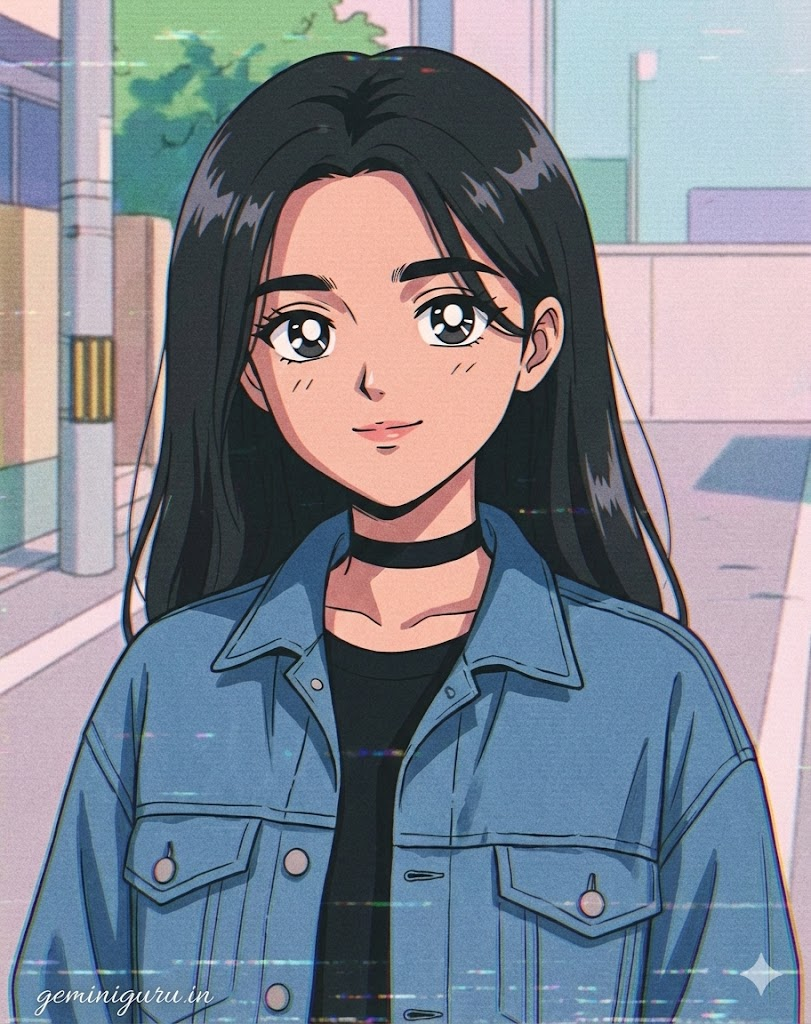 PROMPT: Vintage 1990s anime screenshot. Subject is styled like a 90s protagonist (denim jacket, choker). LIGHTING: Flat “Cel Shaded” lighting with hard shadow lines. ART STYLE: Low-resolution aesthetics. “VHS tape” grain, slight color bleed, and scanlines. Soft, faded pastel colors. Large, expressive eyes with simple highlights.