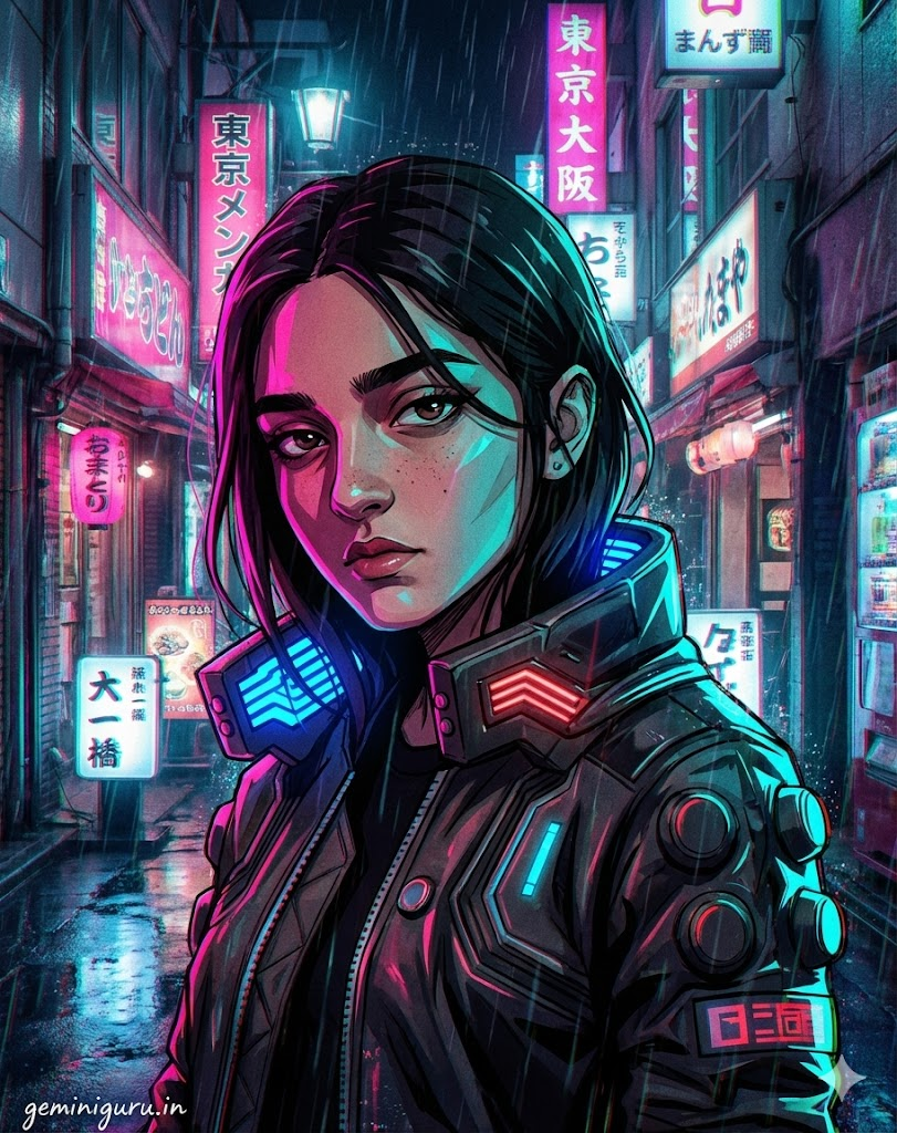 PROMPT: Gritty Sci-Fi anime portrait (Cyberpunk aesthetic). Subject is wearing futuristic techwear jacket with glowing LED collars. Background is a rainy, neon-lit futuristic Tokyo alleyway. LIGHTING: Harsh neon pink and cyan lighting hitting the face. Deep shadows. ART STYLE: Sharp, angular character design. “Chromatic Aberration” (glitch effect) on the edges. Digital noise/grain. Intense, rebellious expression.