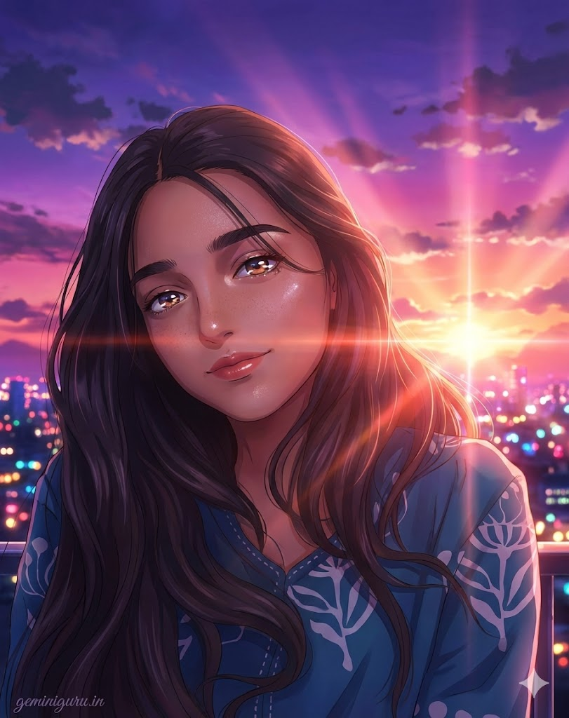 PROMPT: High-fidelity cinematic anime portrait inspired by Makoto Shinkai (“Your Name”). Subject is standing on a city rooftop at twilight (Magic Hour). LIGHTING: Intense, emotional lighting with lens flares and “God Rays” piercing through clouds. The city lights below are starting to twinkle (bokeh). ART STYLE: Crisp digital art, hyper-detailed background. Eyes are glassy and highly reflective. Vibrant purples, pinks, and oranges in the sky.