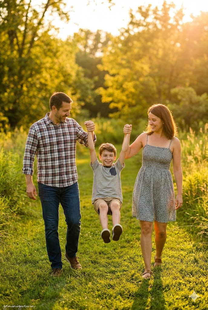 PROMPT: Candid lifestyle family portrait in a lush green park during golden hour. Father, Mother, and Son walking away from the camera or sideways. POSE: Holding hands in a line (Father-Son-Mother). The son is swinging in the air between the parents (playful lifting). Parents looking at the son with love. LIGHTING: Warm golden sunset light coming from behind (Backlight), creating a rim light halo on their hair. Soft lens flare. Cinematic wide angle.