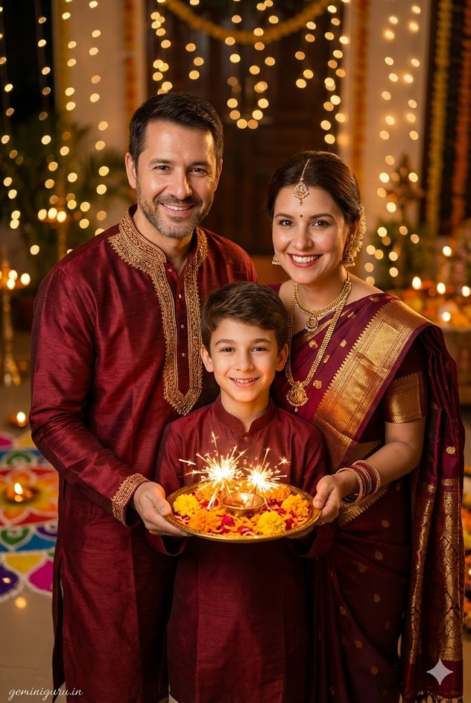 PROMPT: Traditional Indian family portrait (Festive/Diwali vibe). Father in Kurta, Mother in Saree, Son in matching mini-Kurta. Rich colors (Gold, Maroon, Navy). POSE: Standing close together holding a plate of flower petals or sparklers (phuljari). Smiling brightly at the camera. LIGHTING: Warm, festive lighting. Background is filled with blurred fairy lights and oil lamps (Bokeh). The gold embroidery on clothes reflects the light.