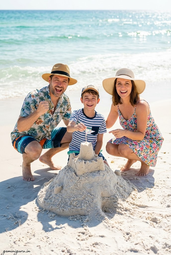 PROMPT: Cheerful vacation portrait on a white sand beach with turquoise water. Family wearing tropical vacation outfits/hats. POSE: Crouched down in the sand building a sandcastle together. The son is placing a flag/shell on top. Parents cheering him on. LIGHTING: Bright, high-contrast sunlight (noon). Vivid colors. Water reflecting the sun. Sharp detail on sand grains.