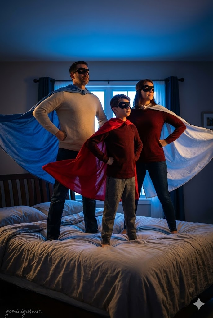 PROMPT: Cinematic creative concept shot. The family is posing as “Superheroes” wearing makeshift capes (bedsheets) and eye masks. POSE: Standing in a “Power Pose” (hands on hips) on top of a bed or sofa, looking heroically into the distance. Wind blowing the capes. LIGHTING: Dramatic “Movie Poster” lighting. Blue backlight (moonlight) and warm key light. Low angle shot to make them look powerful.
