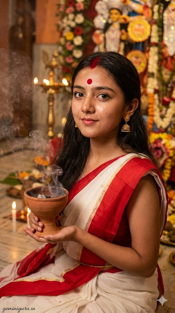 PROMPT: Traditional Bengali portrait (Durga Puja vibe). Subject is wearing a white saree with a wide red border (Lal Paar Saree) draped in the traditional Bengali style. Large red bindi, gold jhumkas. POSE: Holding a “Dhunuchi” (clay incense burner) or offering flowers. Eyes are large and expressive (“Patal Chera” eyes). LIGHTING: Warm, festive lighting (candlelight or temple lamps). Smoke from incense adds atmosphere. Rich, vibrant colors.