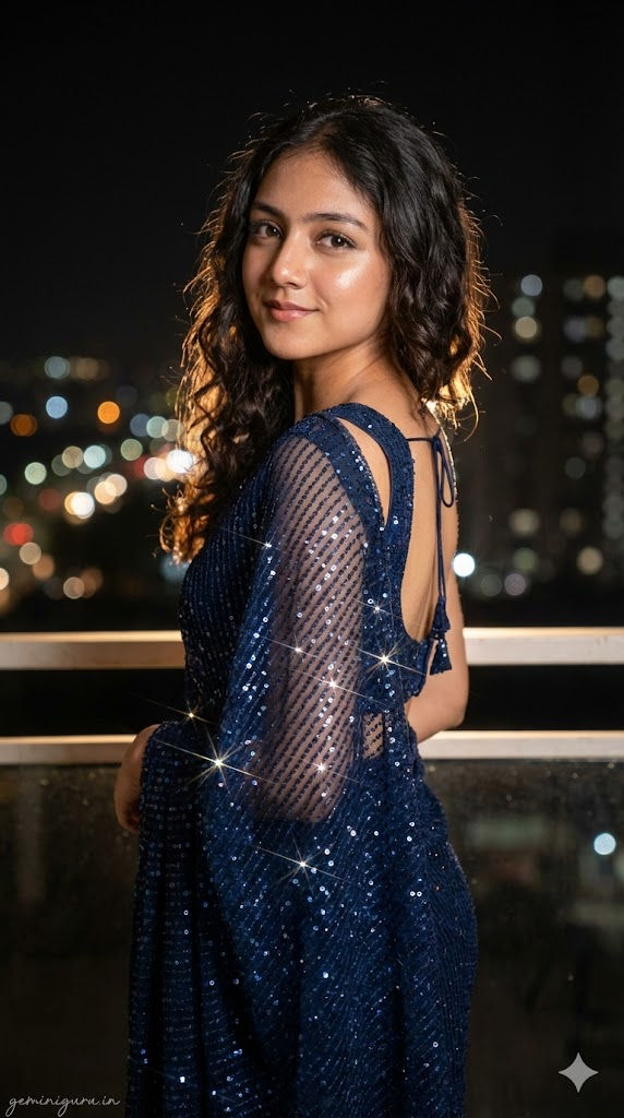 PROMPT: Glamorous night-time fashion shot. Subject is wearing a midnight blue or black net saree fully embellished with sequins (Sabyasachi style). Sleeveless designer blouse. POSE: Standing on a balcony with city lights behind. Looking back over the shoulder (classic diva pose). LIGHTING: City night ambient light with a “Rim Light” to separate the subject. The sequins are reflecting light, creating starburst effects. Background is beautiful bokeh.