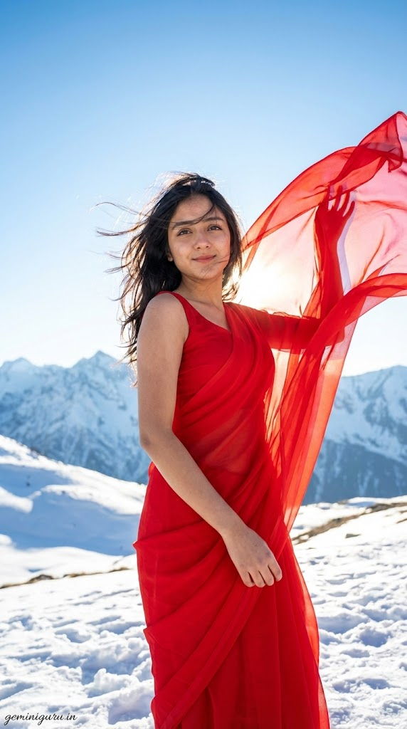 PROMPT: Cinematic Bollywood-style shot in a snow-capped mountain landscape (or Swiss Alps). Subject is wearing a plain, vibrant red chiffon saree with a sleeveless blouse. POSE: Arms open wide or holding the pallu which is flying dramatically in the wind. The fabric is translucent and flowy. LIGHTING: Bright, high-key daylight. The sun is behind the subject, making the saree glow. Soft, romantic atmosphere.