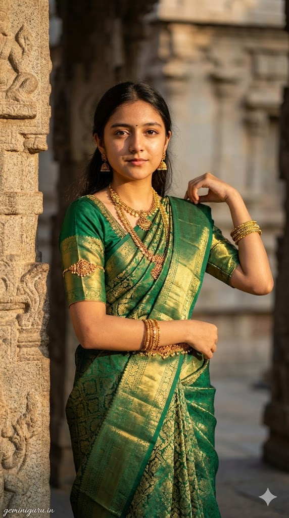 PROMPT: High-end traditional portrait. Subject is wearing a rich emerald green and gold Kanjeevaram silk saree with a broad border. Adorned with heavy Temple Jewellery (gold). POSE: Standing gracefully near a carved stone pillar, adjusting the pallu on the shoulder. Body turned slightly to the side. LIGHTING: Golden Hour sunlight hitting the silk fabric, creating sharp specular highlights on the gold zari work. Background is a blurred ancient temple. Shot on 85mm lens.