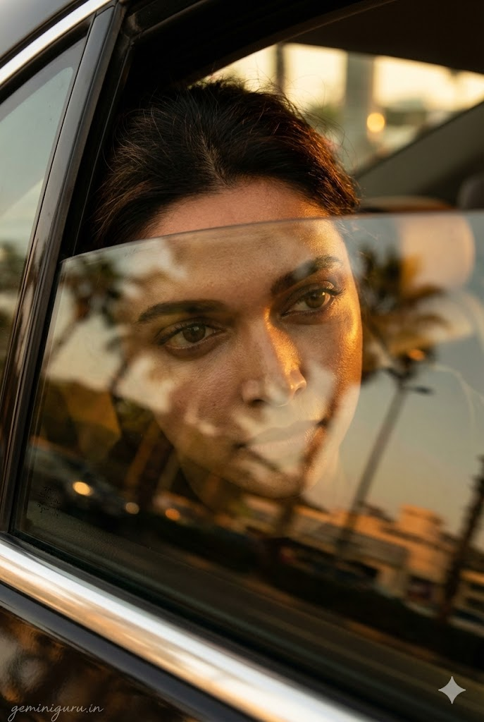 PROMPT: Close-up cinematic shot taken from outside a car window. The subject is sitting in the passenger seat. The reflection on the glass shows passing palm trees or city lights. Focus is on the eyes behind the glass. “Wong Kar-wai” movie aesthetic. POSE: Resting head against the window or hand on the glass. Pensive expression. LIGHTING: Golden hour sunset reflecting on the glass window pane, mixing with the subject’s face. Warm, amber tones.