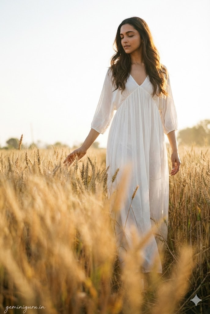 PROMPT: Ethereal portrait in a field of tall dry wheat/grass. Subject is wearing a white flowy dress/shirt. Low angle shot with bokeh foreground. Warm, nostalgic 35mm film grain. POSE: Walking slowly through the field, one hand brushing the tops of the wheat. Eyes closed or looking down peacefully. LIGHTING: Golden Hour sun directly behind the subject, blasting through the grass and hair (sub-surface scattering). Soft, hazy atmosphere.