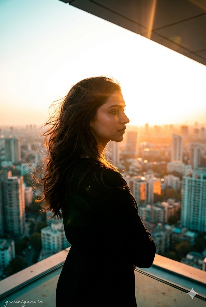 PROMPT: Cinematic wide shot of the subject standing on a high-rise rooftop overlooking a sprawling city at sunset. Warm orange and teal color grading. Lens flare entering from the top corner. Shot on 35mm lens for scale. 8k resolution. POSE: Standing sideways, looking out at the skyline, wind blowing hair gently. LIGHTING: Intense golden hour backlight creating a glowing “rim light” (halo) around the hair and shoulders. The face is lit by soft, warm fill light.