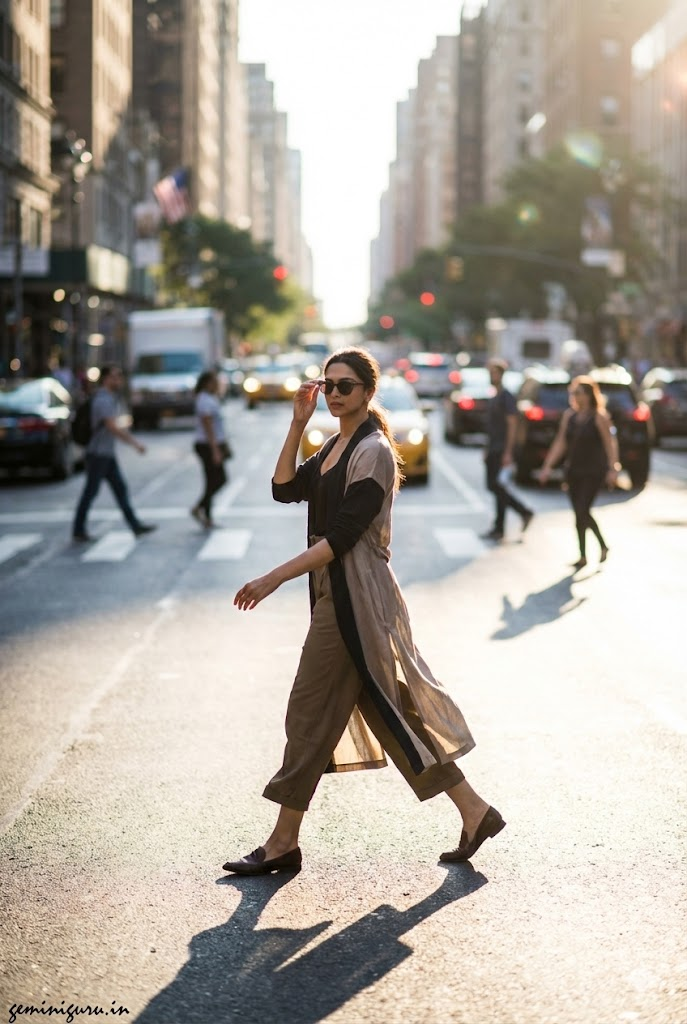 PROMPT: Full-body candid street style shot. Subject is walking across a busy city street. Busy city background is blurred (bokeh). Slight motion blur on the legs/background for realism. High contrast. POSE: Mid-stride walking pose, looking back over the shoulder or adjusting sunglasses. “Off-duty model” vibe. LIGHTING: Backlit by the low sun down the avenue. Long shadows stretching forward on the pavement. Lens flare obscuring part of the buildings.
