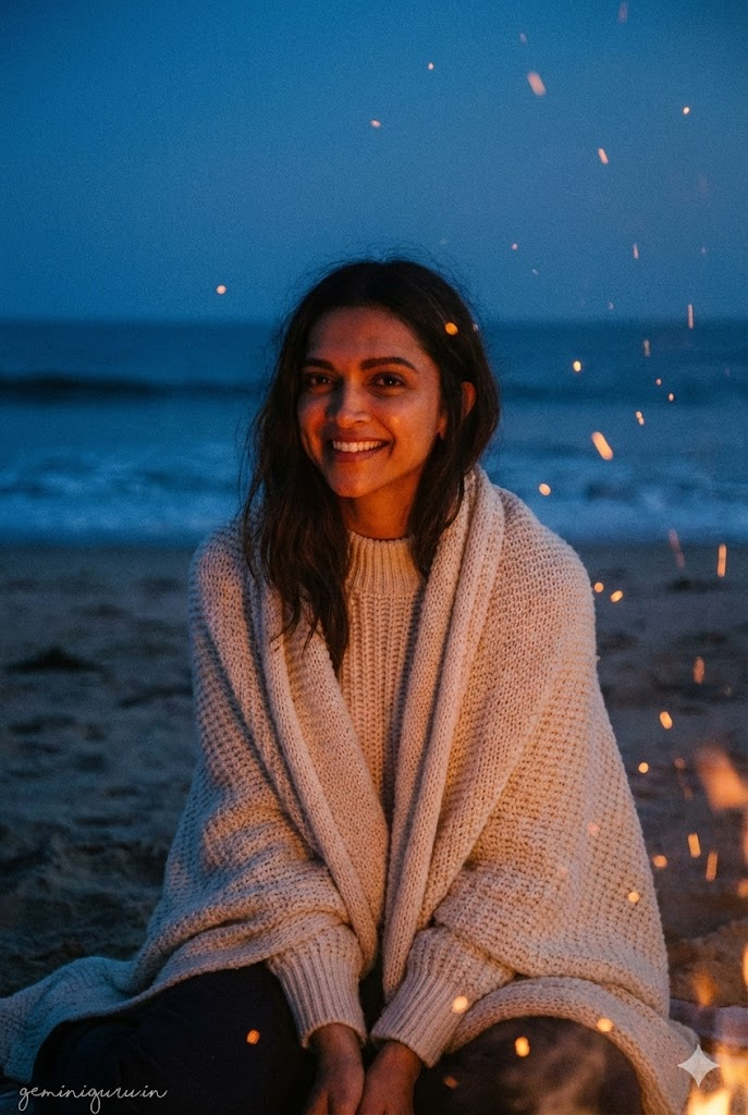 PROMPT: Intimate portrait on a beach at dusk (transition from golden hour to blue hour). Soft, grainy low-light aesthetic. Sparkles or embers in the air. POSE: Wrapped in a blanket or wearing a cozy knit sweater. Sitting on the sand, smiling warmly at the camera. LIGHTING: Mixed lighting—warm orange glow from a nearby bonfire/sunset on the face, contrasting with a deep blue twilight sky and ocean background.