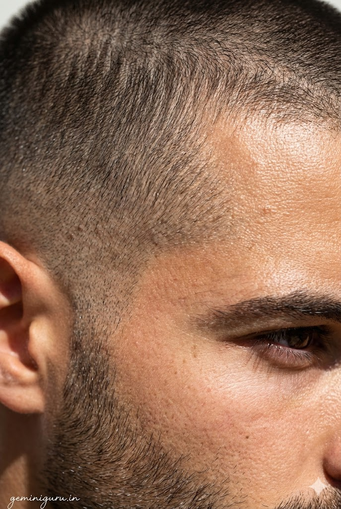 Use uploaded reference image only. Face must be 100% identical and instantly recognizable. No AI smoothing, reshaping, or alteration. Maintain real pores, natural highlights, and authentic human skin texture. Must look like real photography, not digital art. PROMPT: Macro portrait, extreme close-up. Subject with a buzz cut and high skin fade. Focus on the gradient of hair density on the side of the head. Visible scalp texture, razor bumps, natural skin unevenness. Harsh hard light casting sharp shadows. Raw file, uncompressed, neutral color profile.