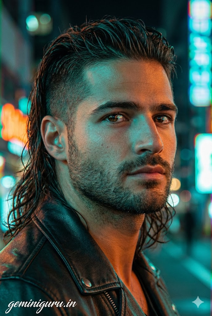 Use uploaded reference image only. Face must be 100% identical and instantly recognizable. No AI smoothing, reshaping, or alteration. Maintain real pores, natural highlights, and authentic human skin texture. Must look like real photography, not digital art. PROMPT: Fashion editorial shot. Subject with a modern mullet (short sides, long back). Neon city night lighting. Cyberpunk color grading (Teal and Orange LUT). Wet hair look. Reflection of neon lights in the eyes. Chromatic aberration on the edges. ISO 800.